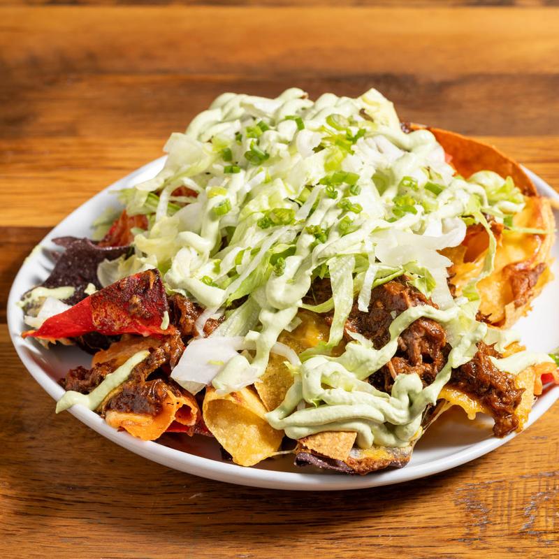 Fried buffalo chicken, bacon, tomato, shredded Mex cheese, side blue cheese.